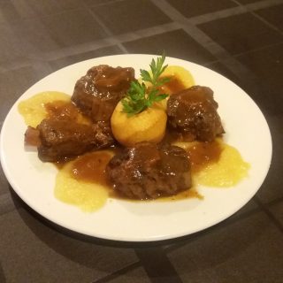 Solomillo de ternera a la plancha con manzana Errezil Sagarra y hongos
